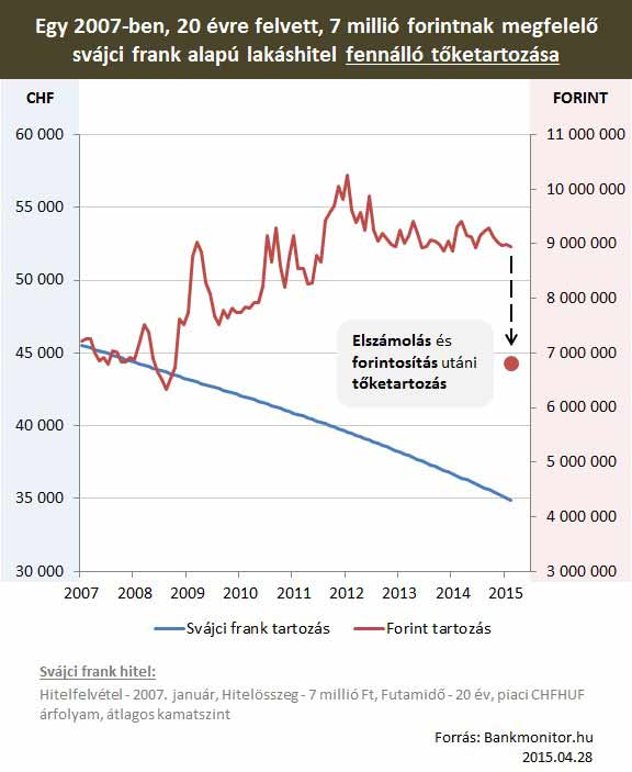 Egy képzeletbeli példán keresztül könnyen megérthetjük, hogyan is lehetséges az, hogy most többel tartozunk, mint hitelfelvételkor annak ellenére, hogy minden alkalommal pontosan fizettünk. Tegyük fel, hogy H. György 2007-ben, 20 éves futamidőre, 7 millió forintnak megfelelő svájci frank hitelt vett fel.